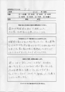 施術中は先生の手があたっている場所が暖かく感じます。自分の頭の中のことや日常で起こったこと等、知り合いには少し気が引けてしまうことも話せて、ありがたいと思います。