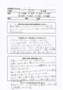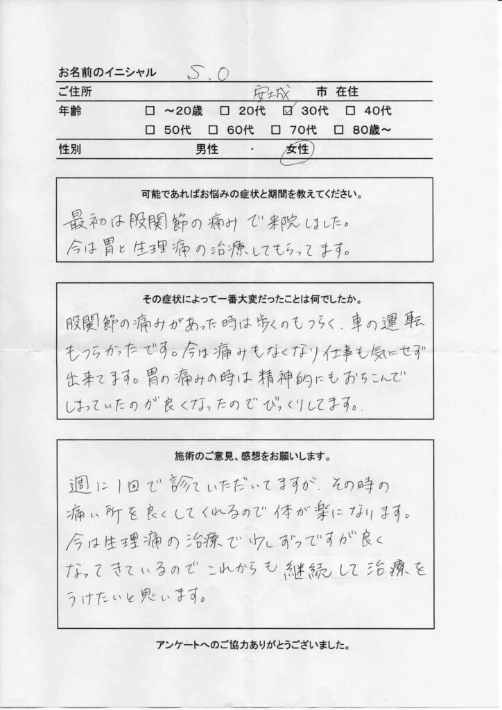 週に一回で診ていただいていますが、そのときの痛いところを良くしてくれるので体が楽になります。今は生理痛の治療で少しずつですが良くなっているので、これからも継続して治療を受けたいと思います。