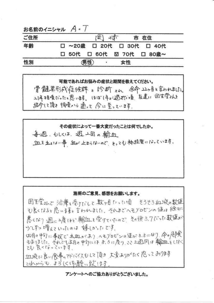 回生堂さんで治療を受け出して数ヶ月たった頃、「そろそろ血液の数値も良くなると思います」と言われました。それまでヘモグロビンの価は徐々に悪くなり、週に2度ほど輸血を受けていたので、その後3.7だった数値が少しずつ増えていったのは嬉しかったです。
