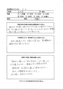 血液に良い食事のアドバイスもして頂き、大変ありがたく思っております。これからもよろしくお願い致します。